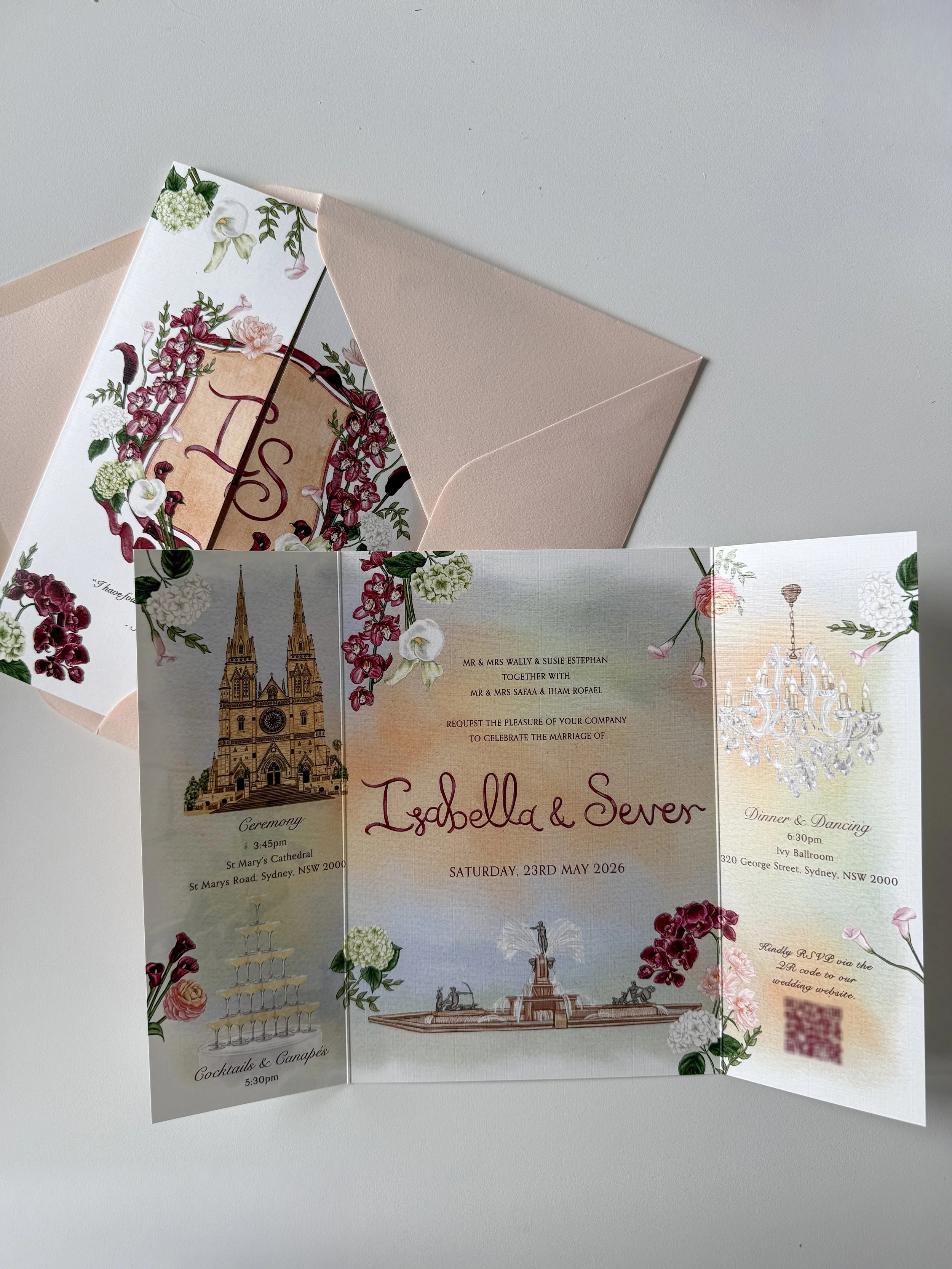 The aim was to create a gatefold invitation that beautifully encapsulates the florals of their wedding day while also highlighting the key locations around Sydney where important moments of the celebration will take place.